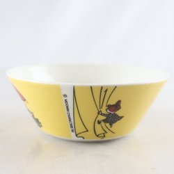 Mumin skål från Arabia. Skålen är gul med motiv av Muminfigurer. Den är diskmaskinssäker, mikrovågssäker och ugnssäker.