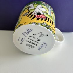 Muminmugg med motiv av Muminpappan som läser en bok i ett träd. Muggen är designad av Arabia.