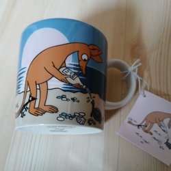 Muminmugg med motiv av Sniff på stranden. Muggen är helt oanvänd etikett och lapp sitter kvar.