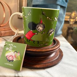 Muminmugg från Arabia. Muggen har ett motiv i svart och vitt med inslag av orange. På undersidan står ”Moomin Characters TM by Arabia” samt ”Dishwasher safe Microwave safe Oven to table”.