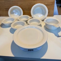 Porslin från Arabia. Skål 26,5 cm innermått i diameter och 9 cm hög. 4 mindre fat 27 cm och 3 tallrikar 23,5 cm i diameter.