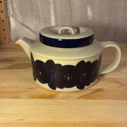 Tekanna från Arabia, tillverkad i Finland. Kannan är brun med ett handtag i rotting.