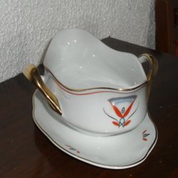 En fin såsskål med tillhörande fast fat från Arabia Finland. Den har en grön rand och guldfärgade detaljer.