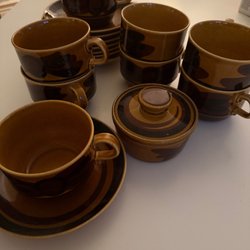 Servis från Barratts, Old Castle serie. Innehåller kanna, skål, gräddkanna, sockerskål, soppskål.