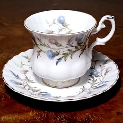 Bilden föreställer en kopp och ett fat i mönstret "Glorious Devon" från den engelska porslinstillverkaren Shelley.