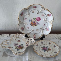 Royal Crafton i mönstret Sumatra. Setet inkluderar en kopp, ett fat och en assiett. Designen har ett blommigt mönster i rosa och blått med guldfärgade detaljer.