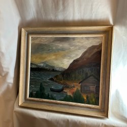 En vacker tavla som föreställer ett landskap med vatten och träd. Den har en dekorativ guldfärgad ram. Signerad.