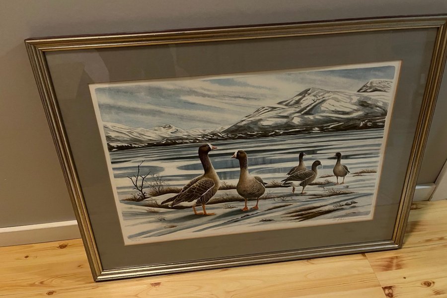 En tavla med motiv av gäss i ett vinterlandskap. Dag Peterson.