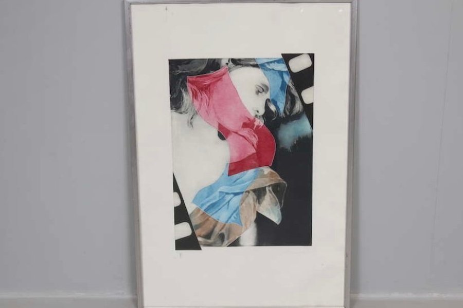 En vacker tavla med ett unikt motiv. Färgerna rosa, blått och brunt dominerar bilden, som har ett abstrakt uttryck.Alain Soucasse litografi 74/75 48 X 34