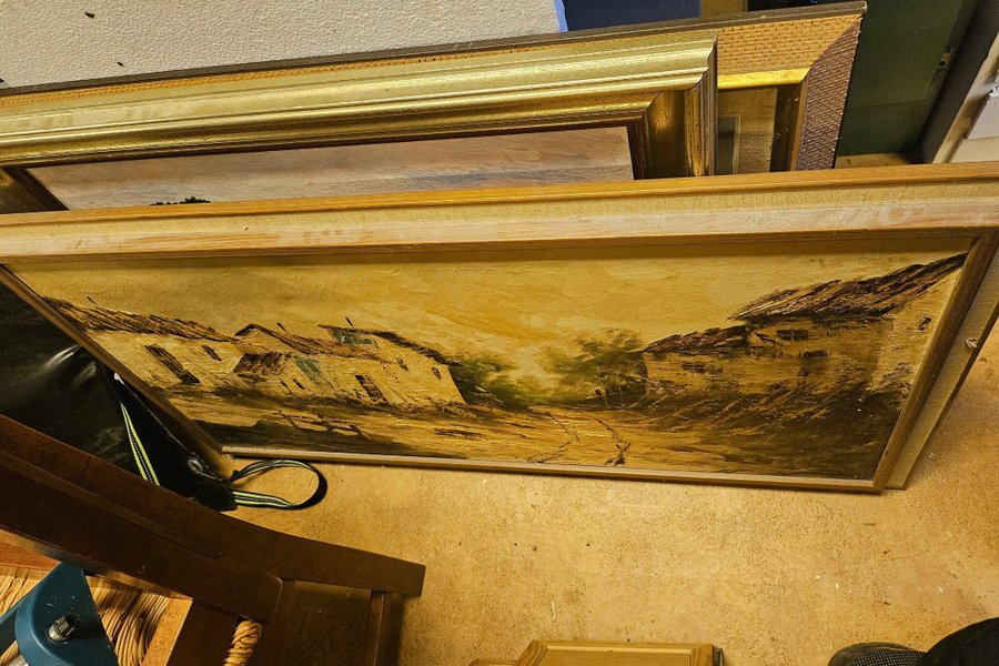 Tavla med motiv av hus i ett landskap. Målningen har en varm färgpalett med gula och bruna toner. Detaljerade penseldrag ger textur åt husens tak och omgivande vegetation.