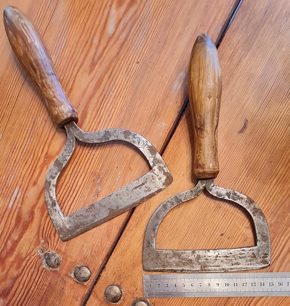 1900-talets början, 2 st kötthack / hackknivar i bra skick. Svarvade trähandtag och järnsmide. Perfekt till att hacka lök.