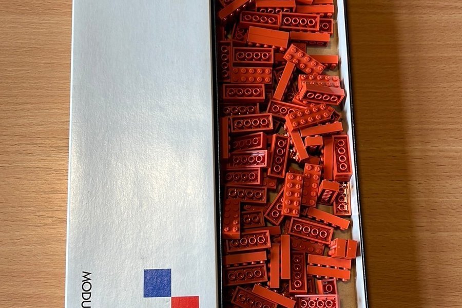Modulex klodser i rød farve. Kassen indeholder et udvalg af røde Modulex klodser.