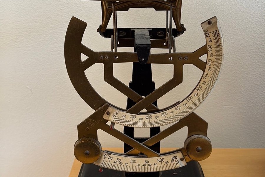 Brevvåg i metall med svart bas och mässingsfärgade detaljer. Vågen har två skalor för viktmätning.