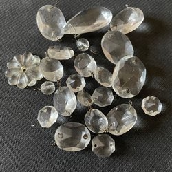 En gammal låda med prismor med en massa diverse prismor och en gammal låda