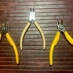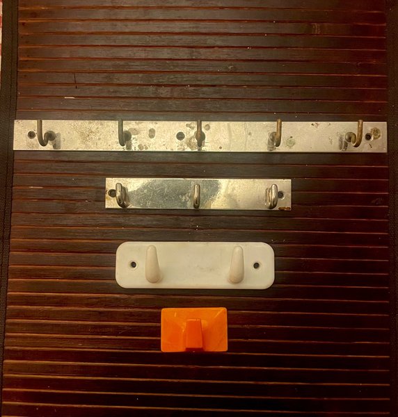 Två metallkrokslister, en vit plastkroklist och en orange.