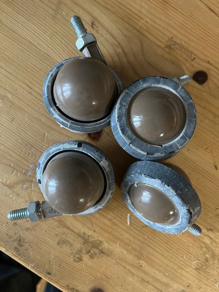 Set med fyra möbelhjul. Hjulen är bruna och har en kulformad design. De är försedda med gängade skruvar för enkel montering.dom verkar oanvända, verkar vara nåt skyddsvax ( därav ljusa i rulldel- gummit, går lätt att få bort, skrapat med nageln) . rullar fint i alla riktningar. Ytterdiameter ca 6 cm. Fästbult diameter strax under 8 mm. Kan sannolikt vara tummått. Om det är så bör det vara 5/16 tum.