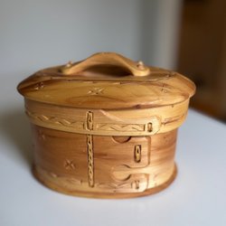 En vacker träask med ett detaljerat mönster på locket. Asken har ett lock och är indelad i två fack inuti. Perfekt för förvaring av småsaker. 18 x 10 cm.