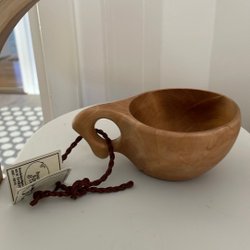 En kåsa i trä med ett kort handtag och en läderrem för upphängning. Kåsan har en naturlig träfinish.