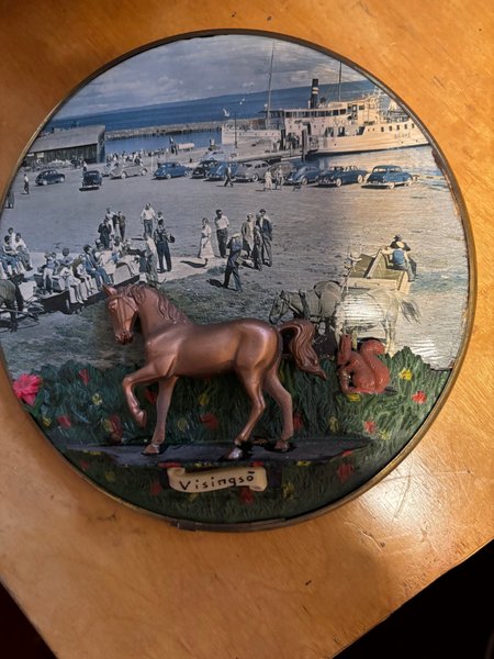 En väggtavla med motiv från Visingsö. Tavlan har en dekorativ design med en häst och en ekorre i relief.15 cm ca i diameter