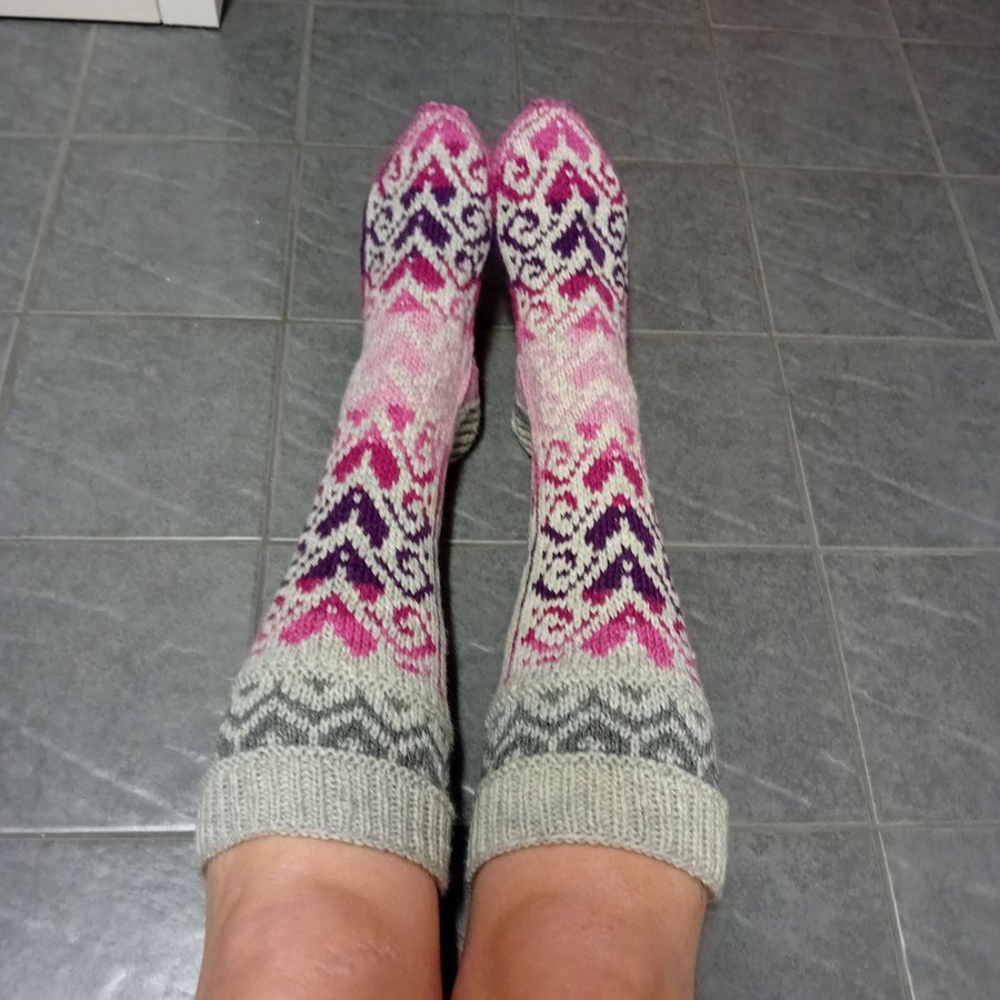 Sockor med en jacquardstickad mönsterbild av vackra hjärter.