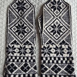 OBS!!!! Ett par, stickade vantar med ett detaljerat mönster i beige och vitt. Mönstret inkluderar ränder på muddarna och ett snöflinge- eller stjärnliknande motiv över handryggen, samt ett mindre, upprepat mönster på handflatan och tummen. Vantarna har en spetsig avslutning vid fingrarna. (AI-beskrivning, tack, ha ha)