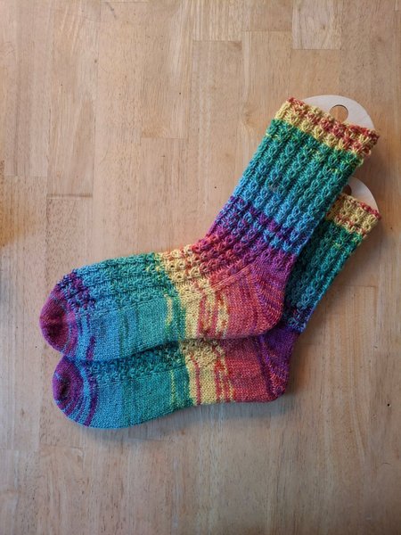 Ett par nya handstickade raggsockor i regnbågens alla färger. Stickade I raggsocksgarn 75 % ull.
