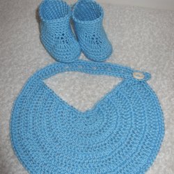 Ett sött set med en haklapp och ett par matchande tossor, båda handgjorda i en fin rosa nyans.