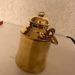 Plunta i metall med guldfärgad yta. Märkt 1 Kvarter med kungakrona. Volym ca 0,82 liter. Kork medföljer, men den är skadad