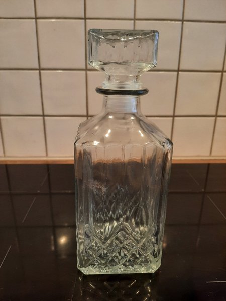 Glaskaraff med propp. Karaffen har en fasetterad design och en fyrkantig form.