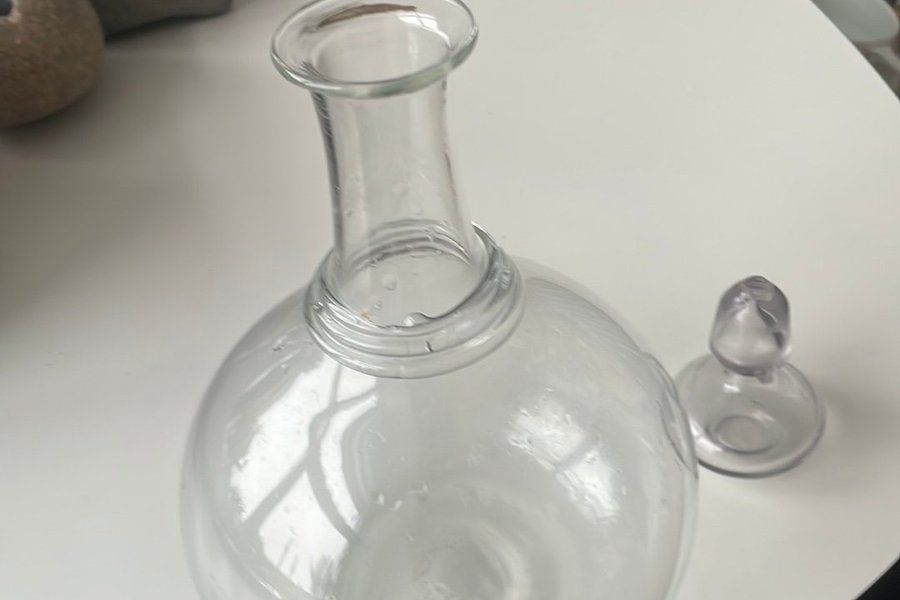 Karaff i glas med propp. Karaffen har en rundad kropp och en smal hals.