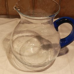 En glaskanna med handtag och pip. Kannan har en rundad kropp och en stabil bas.