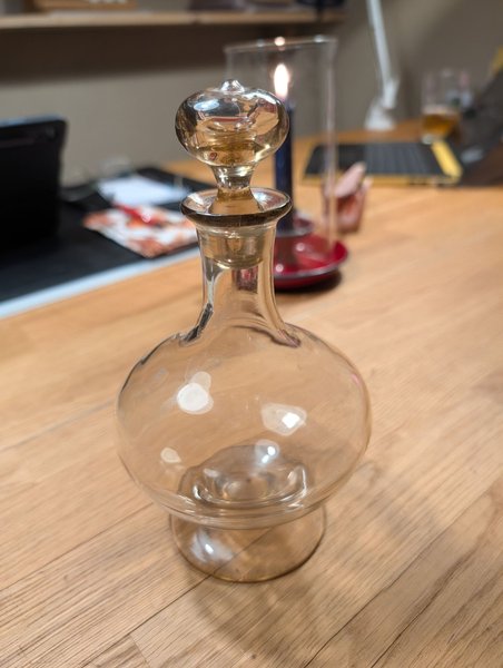 En karaff i glas med tillhörande propp. Karaffen har en bärnstensfärgad ton.