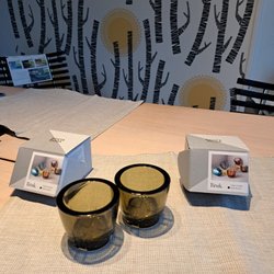 Två rektangulära glasflaskor med metallkorkar