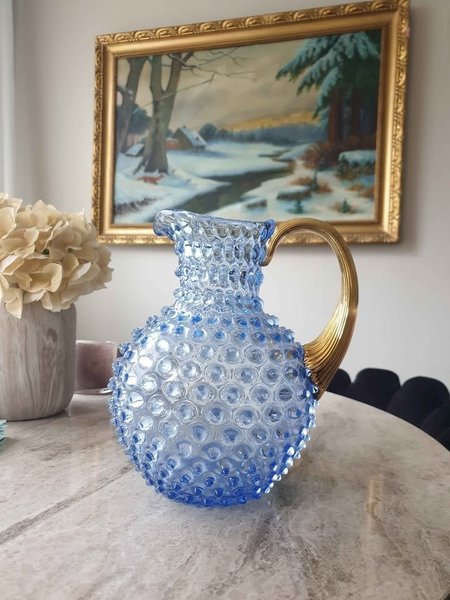 En blå glaskanna med ett mönstrat yttre. Kannan har ett guldfärgat handtag.