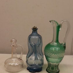 En karaff i slipat glas och en karaff i grönt glas med målade detaljer.