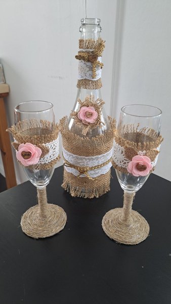 Set med en dekorerad flaska och två glas. Flaskhalsen är dekorerad med ett guldfärgat band och ett hjärta med texten "love". Flaskans kropp är dekorerad med ett vitt spetsband och en rosa blomma med texten "love". Glasen är dekorerade med ett vitt spetsband och en rosa blomma med texten "love". Glasens fot är lindad med snöre.