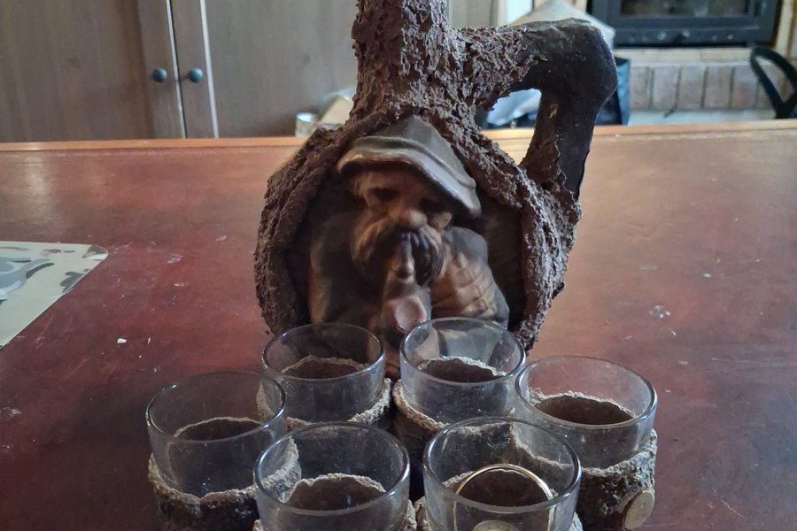 Karaff med en figur av en man med skägg och hatt. Tillhörande 6 snapsglas med träliknande utsida.