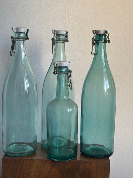 Set med fyra glasflaskor med patentkork. Flaskorna är i olika storlekar och har en blågrön nyans.