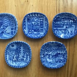 Fem Selters Classic flaskor i turkos glas med skruvkork. Flaskorna har en dekorativ präglad design.