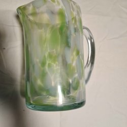 Grön glaskanna med handtag och pip. Ser handblåst ut med små bubblor i glaset. Fint skick! Höjd 20,5 cm och 10 cm i diameter.