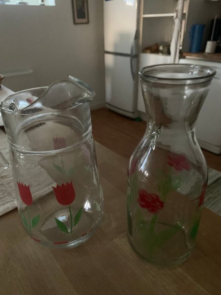 Två glasflaskor med blommönster. En av flaskorna har ett handtag och pip. Den andra är en karaff