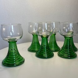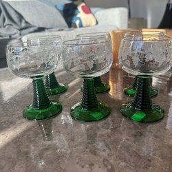 Ett set med eleganta vinglas med grön fot och vacker gulddekor. Perfekt för speciella tillfällen eller för att lyxa till vardagen.