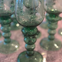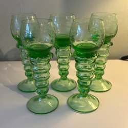 6 stycken illgröna vinglas. Tror inte de är använda utan blivit stående i baren som prydnad i gillestugan hos faster. Mått 13,5 cm och kupan 8 cm i diameter. Jag tror inte dessa mår bra i hög värme i diskmaskin. Jag handdiska av dem. Bara en rekommendation. Titta på bilderna.