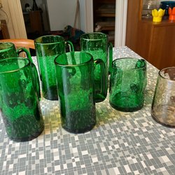 Set med ölsejdlar från Åke Elmér, Björkshult. Handblåsta glas klädda i mässingsöverdrag och handtag i teak.