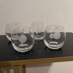 Set med 4 glas. Glasen har en fyrkantig form med rundade hörn och en räfflad textur på sidorna. De är tillverkade av klart glas.