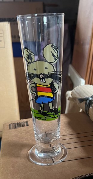 Ett glas av Lasse Åberg med mus med en randig tröja i rött, gult och blått, samt blåa byxor. Musen står på ett grönt underlag. Glaset är genomskinligt och har en stabil bas.