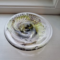 Tyvärr några mycket små nagg längs kanten och lite vass på undersidan i botten. Förekommer även vissa repor. Dock en fin assiett som kanske kan användas som krukfat eller dyl om man inte vill ha det att äta på?