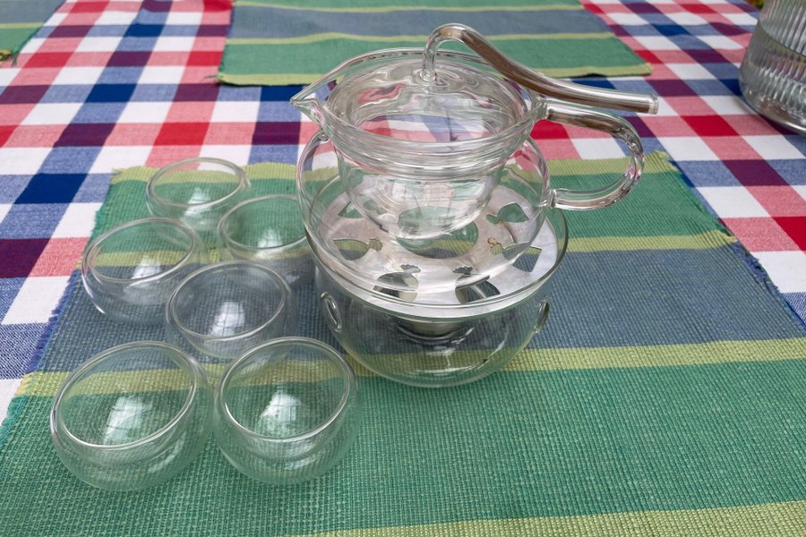 Ett kinesiskt te-set med fyra små koppar med dubbelvägg och med kanna och värmare, allt i glas.