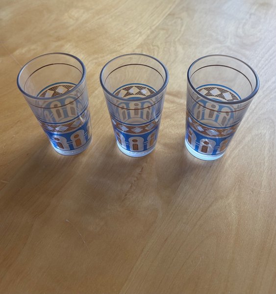3 Marockanska teglas med blått och guldfärgat mönster. 8,5 cm höga. Perfekta för te eller som dekoration.