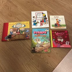 Ett paket med åtta barnböcker. Inkluderar titlar som 'Albert och Anna på dagis', 'Max och Maja', 'Apboken', 'Varför är stora apan så arg?', 'Den mörkrädda fladdermusen', 'Varulven är vaken', 'Pan i hela världen' och 'Amanda Cromwell löser DEJEKTIVgåtorna'.